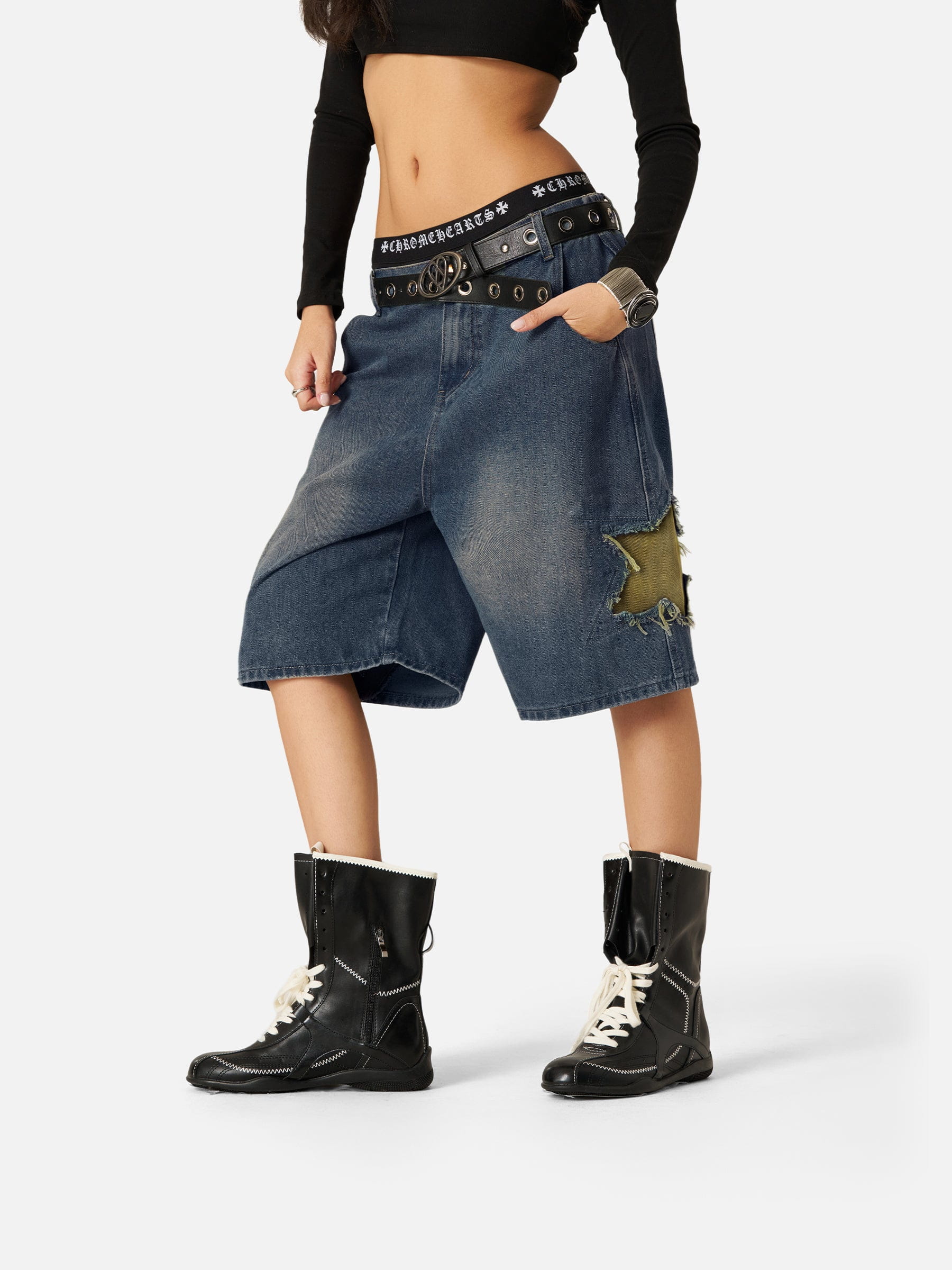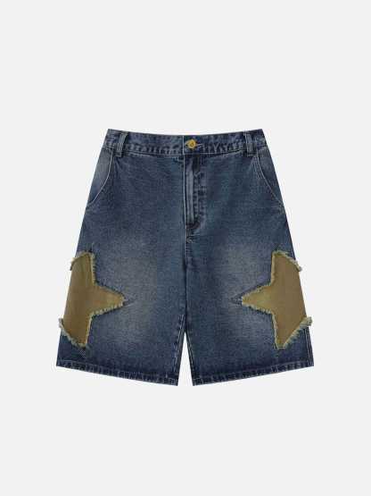 Featuring a constellation of stars stitched onto distressed denim. Not just denim. This is patched rebellion, with raw-edged stars that channel vintage DIY spirit and street-born confidence.